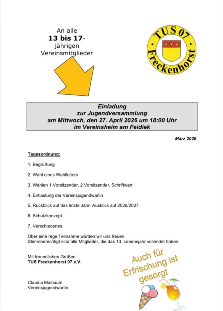 Bericht Glocke vom 06.03.2026 Der TUS Freckenhorst 07 e.V. begrüßt und unterstützt die Bemühungen des Stadtsportverband (SSV) Warendorf e.V. ausdrücklich. weiterlesen
