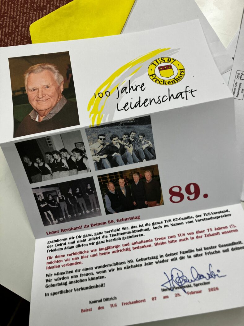 Tischtennis hält fit bis ins Alter! Dafür stehen zwei in die Jahre gekommene, aber sehr rüstige Kämpen der Tischtennisszene im TUS Freckenhorst 07. Rudi Ahlbrand (90) und Bernhard Hustert (89), beide Ehrenmitglieder des traditionsreichen Clubs, feierten jetzt ihre Geburtstage. Der für die älteren TUS-Mitglieder zuständige Beirat hat die beiden natürlich besucht und beglückwünscht.