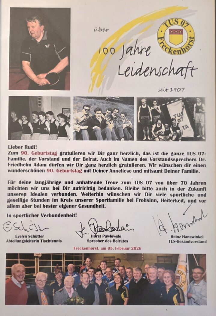 Zum runden 90. Geburtstag von Rudi Ahlbrand gratulierten, neben Horst Pawlowski für den Beirat, auch die Tischtennisabteilungsvorsitzende Evelyn Schütter und Heinz Hanewinkel für den Gesamtvorstand. Alle drei Gratulanten gestandene Tischtennissportler.