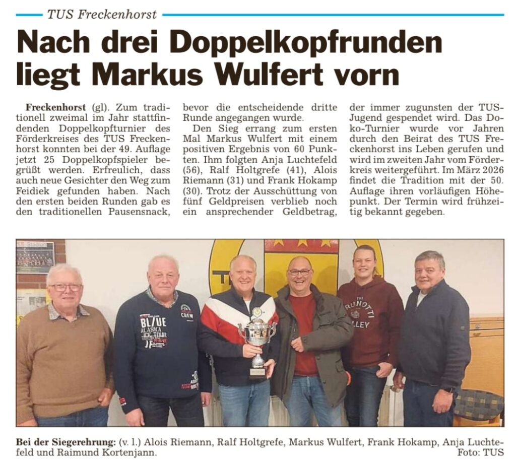 Habbe und Mevert hören als Organisatoren auf und zum nächsten Turnier, am 15.11.2024, übernimmt der TUS Förderkreis die Veranstaltung Bericht... weiterlesen