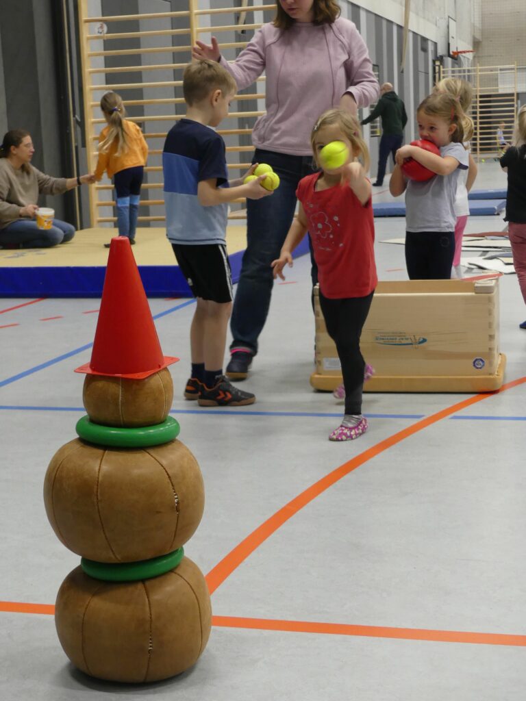 Danach ging es in die Wichtelweihnachtswerkstatt. Es waren 9 Stationen in der Halle aufgebaut. Die Kinder hatten mit ihren Eltern die Möglichkeit mit dem Schlitten durch einen Parkour zu fahren. Weiterhin mussten sie sich Weihnachtssymbole merken, danach eine Strecke klettern und am Ende mussten sie das Symbol wieder erkennen. Sie durften einen Tannenbaum aus Reifen mit verschiedenen Materialien schmücken und einen Schneeberg mit Schwung runterrutschen. Außerdem wurde ein Schneemann mit Bällen abgeworfen und an der Sprossenwand wurde Wichtelmemory gespielt. Weiter ging es zum Teig ausrollen und die Kinder mussten das Christkind beim Glöckchen läuten helfen. Eine weitere Station war den Adventskranz anzünden, hier zogen sich die Kinder an einem Seil entlang auf einem Rollbrett und legten nach und nach Tennisbälle in Ringe hinein.