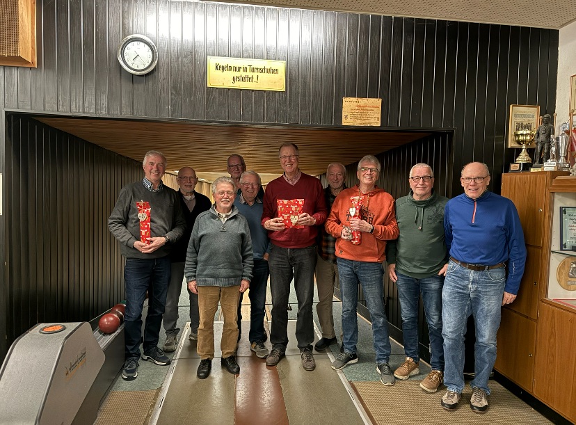 Immer montags, von 16.00 -17.30 Uhr, treffen sich in der neuen Freckenhorster Sporthalle bis zu 18 Senioren des TUS 07 Freckenhorst um durch Gymnastik und gezielte Übungen fit und beweglich zu bleiben. Übungsleiter Hermann Siemer versteht es, die Beweglichkeit der Teilnehmer durch unterschiedliche Übungen zu erhalten und zu fördern. Nach den gymnastischen Übungen erfreut sich das interne Volleyballspiel besonderer Beliebtheit. Neben dem wöchentlichen Fitnessprogramm steht im Jahreskalender eine Fahrradtour im Sommer mit abschließendem Grillen und das vorweihnachtliche Kegeln, welches kürzlich durchgeführt wurde. Als beste Kegler konnten sich – Bild mit Präsent von rechts – Peter Gehdik, Conrad Schenke und Bernd Halbuer die ausgelobten Präsente sichern.
